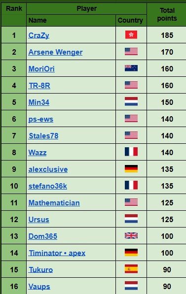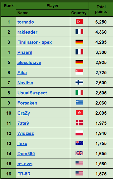 3) the highest number of points from one single tournament, then, if needed, the second highest, and so on.