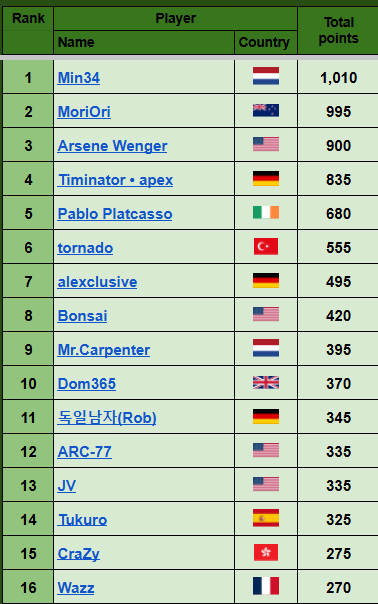 3) the highest number of points from one single tournament, then, if needed, the second highest, and so on.
