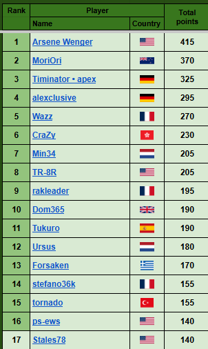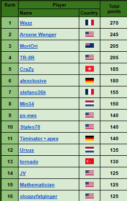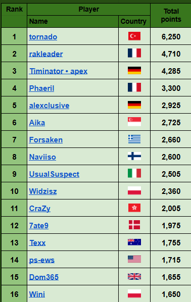3) the highest number of points from one single tournament, then, if needed, the second highest, and so on.