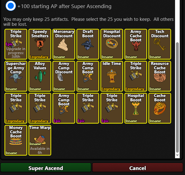 I have super-ascended a seventy-eighth time. Boon chosen: +25% AP from levels Total boons: +1000% AP, +26 arti, +1200 AP Artifacts carried over: