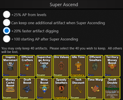 I have super-ascended a ninety-second time. Boon chosen: +25% AP from levels Total boons: * +1200 AP at startup * +1225% AP from levels * +26 artifact carryover * +5 artifact dig speed Artifacts carried over:
