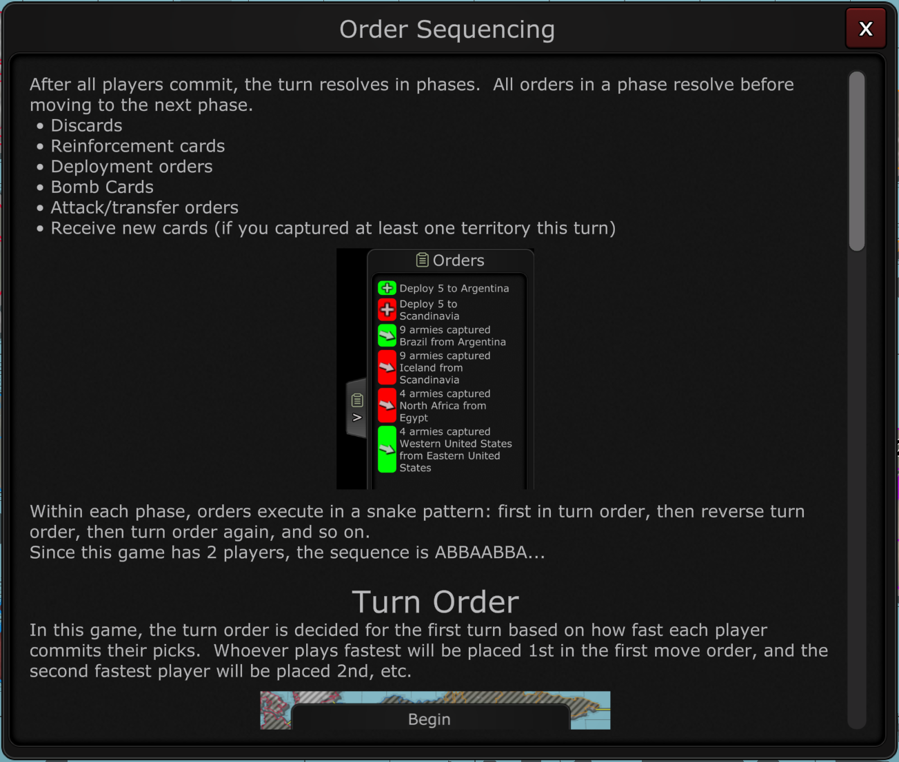 Guides are still a work in progress. This update introduces 11 guides: basics, combat, fog, cards, wastelands, commanders, picking starts, distribution, bomb card, order sequencing, and basic strategy. These are enough to fully cover the rules for three templates: Small Earth Auto Dist, Small Earth One Wasteland, and Small Earth Commanders and Bomb Cards. If you open a game using any of these templates, selecting Help -> Guides will walk you through everything you need to know to play. Other templates are not fully supported yet, and may be met with pages that inform the guides aren’t implemented yet.